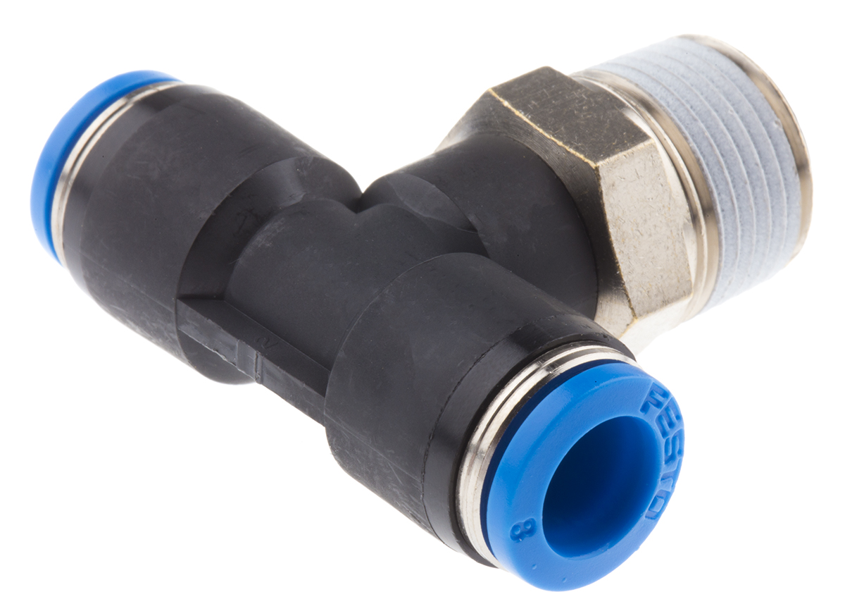 This is Pneumatic Tee Threaded-to-Tube Adapter R 3/8 Male x 8mm x 8mm 14 bar manufactured by Festo. The manufacturer part number is QST-3/8-8. A quality product with a nice nickel plated finish. Whereas, the minimum operating temperature of the product is -10°c. It features 14 bar maximum operating pressure. While the connector B is push in 8 mm. Moreover, its thread is made up of brass material . The connector A is push in 8 mm connector. While it has 153111 of model number. The product has a threaded-to-tube style. The threaded connection is r 3/8 male. The product has a qs manufacturer series. The pneumatic fitting is a tee threaded adaptor. It has a maximum operating temperature of +80°c.