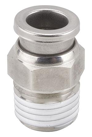 This is Pneumatic Straight Threaded-to-Tube Adapter NPT 1/4 Male Push In 3/8 in manufactured by SMC. The manufacturer part number is KQG2H11-N02S. It features 1 mpa maximum operating pressure. The product is available in inline configuration. While the connector B is push in 3/8 in. The connector A is npt 1/4 male connector. The threaded connection is npt 1/4 male. The product has a threaded-to-tube style. The product's body is nicely designed from stainless steel materials. The product has a kqg2 manufacturer series. Whereas, the minimum operating temperature of the product is -5°c. The pneumatic fitting is a straight threaded adaptor. It has a maximum operating temperature of +150°c.