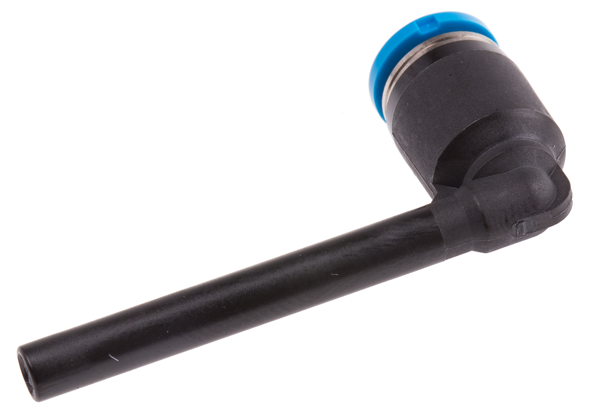 This is Pneumatic Elbow Tube-to-Tube Adapter Push In 4 mm to Push In 4 mm manufactured by Festo. The manufacturer part number is QSL-4HL. It is designed for food grade no . It has a 90° angle . It features 14 bar maximum operating pressure. The product is available in inline configuration. While the connector B is push in 4 mm. Moreover, its thread is made up of nickel plated brass material . Whereas, the minimum operating temperature of the product is -10°c. The connector A is push in 4 mm connector. While it has 153065 of model number. The product has a tube-to-tube style. The product's body is nicely designed from pbt materials. The product has a qsl manufacturer series. It is resistant to chemical no . The pneumatic fitting is a elbow tube-totube adaptor. It has a maximum operating temperature of +80°c. It includes a swivel connection .