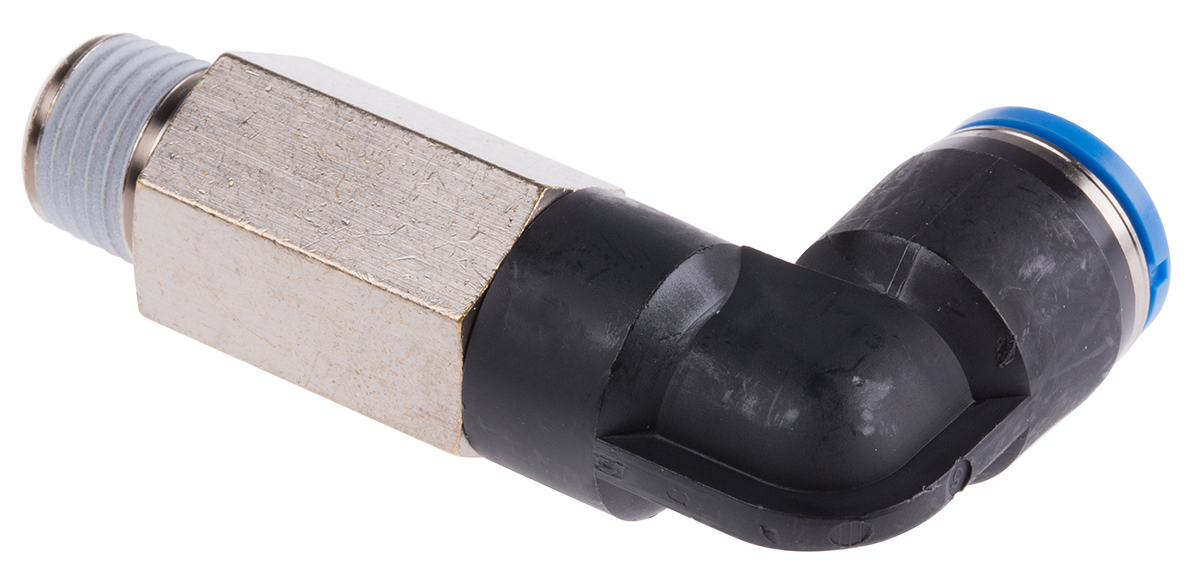This is Pneumatic Elbow Threaded-to-Tube Adapter R 1/4 Male Push In 10 mm 10mm Tube Connection manufactured by Festo. The manufacturer part number is QSLL-1/4-10. It is designed for food grade no . It has a 90° angle . It features 14 bar maximum operating pressure. The product is available in inline configuration. While the connector B is push in 10 mm. Moreover, its thread is made up of nickel plated brass material . Whereas, the minimum operating temperature of the product is -10°c. The connector A is r 1/4 male connector. While it has 153082 of model number. The threaded connection is r 1/4 male. The product has a threaded-to-tube style. The product's body is nicely designed from pbt materials. The product has a qs manufacturer series. It is resistant to chemical no . The pneumatic fitting is a elbow threaded adaptor. It has a maximum operating temperature of +80°c. It includes a swivel connection .