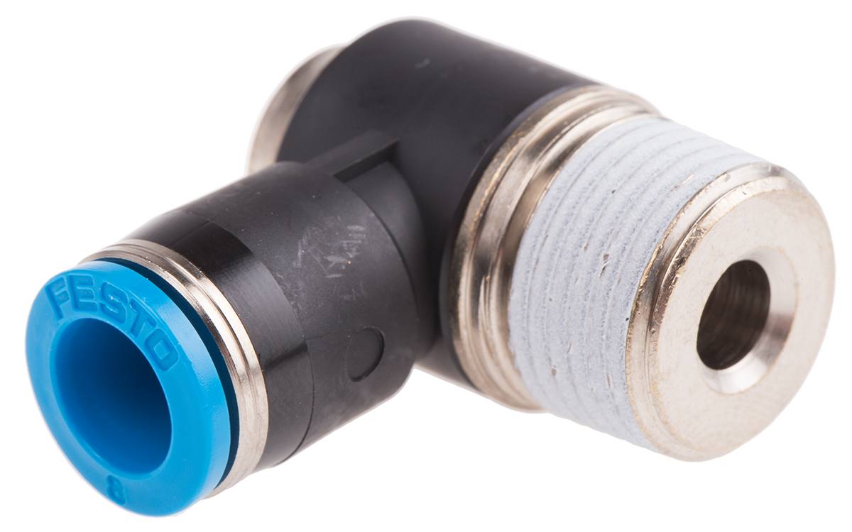 This is Pneumatic Elbow Threaded-to-Tube Adapter R 3/8 Male Push In 8 mm 8mm Tube Connection manufactured by Festo. The manufacturer part number is QSLV-3/8-8-I. It is designed for food grade no . It has a 90° angle . It features 14 bar maximum operating pressure. The product is available in inline configuration. While the connector B is push in 8 mm. Moreover, its thread is made up of nickel plated brass material . Whereas, the minimum operating temperature of the product is -10°c. The connector A is r 3/8 male connector. While it has 153101 of model number. The threaded connection is r 3/8 male. The product has a threaded-to-tube style. The product's body is nicely designed from pbt materials. The product has a qs manufacturer series. It is resistant to chemical no . The pneumatic fitting is a elbow threaded adaptor. It has a maximum operating temperature of +80°c. It includes a swivel connection .