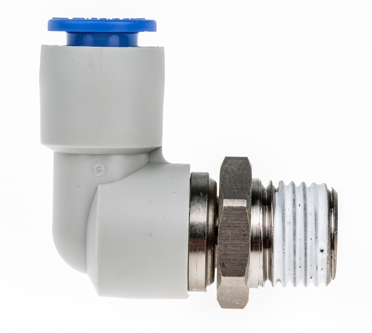 This is Rotary Adapter R 1/4 Male Push In 8 mm manufactured by SMC. The manufacturer part number is KSL08-02S. It has a 90° angle . It features 1 mpa maximum operating pressure. Moreover, its thread is made up of nickel plated brass material . The product's body is nicely designed from pbt materials. The product has a threaded-to-tube style. The threaded connection is r 1/4 male. The product has a ks manufacturer series. Whereas, the minimum operating temperature of the product is -5°c. It has a maximum operating temperature of +60°c.