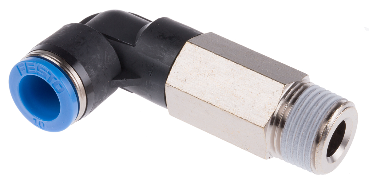 This is Pneumatic Elbow Threaded-to-Tube Adapter R 3/8 Male Push In 10 mm 10mm Tube Connection manufactured by Festo. The manufacturer part number is QSLL-3/8-10. It is designed for food grade no . It has a 90° angle . It features 14 bar maximum operating pressure. The product is available in inline configuration. While the connector B is push in 10 mm. Moreover, its thread is made up of nickel plated brass material . Whereas, the minimum operating temperature of the product is -10°c. The connector A is r 3/8 male connector. While it has 153083 of model number. The threaded connection is r 3/8 male. The product has a threaded-to-tube style. The product's body is nicely designed from pbt materials. The product has a qs manufacturer series. It is resistant to chemical no . The pneumatic fitting is a elbow threaded adaptor. It has a maximum operating temperature of +80°c. It includes a swivel connection .