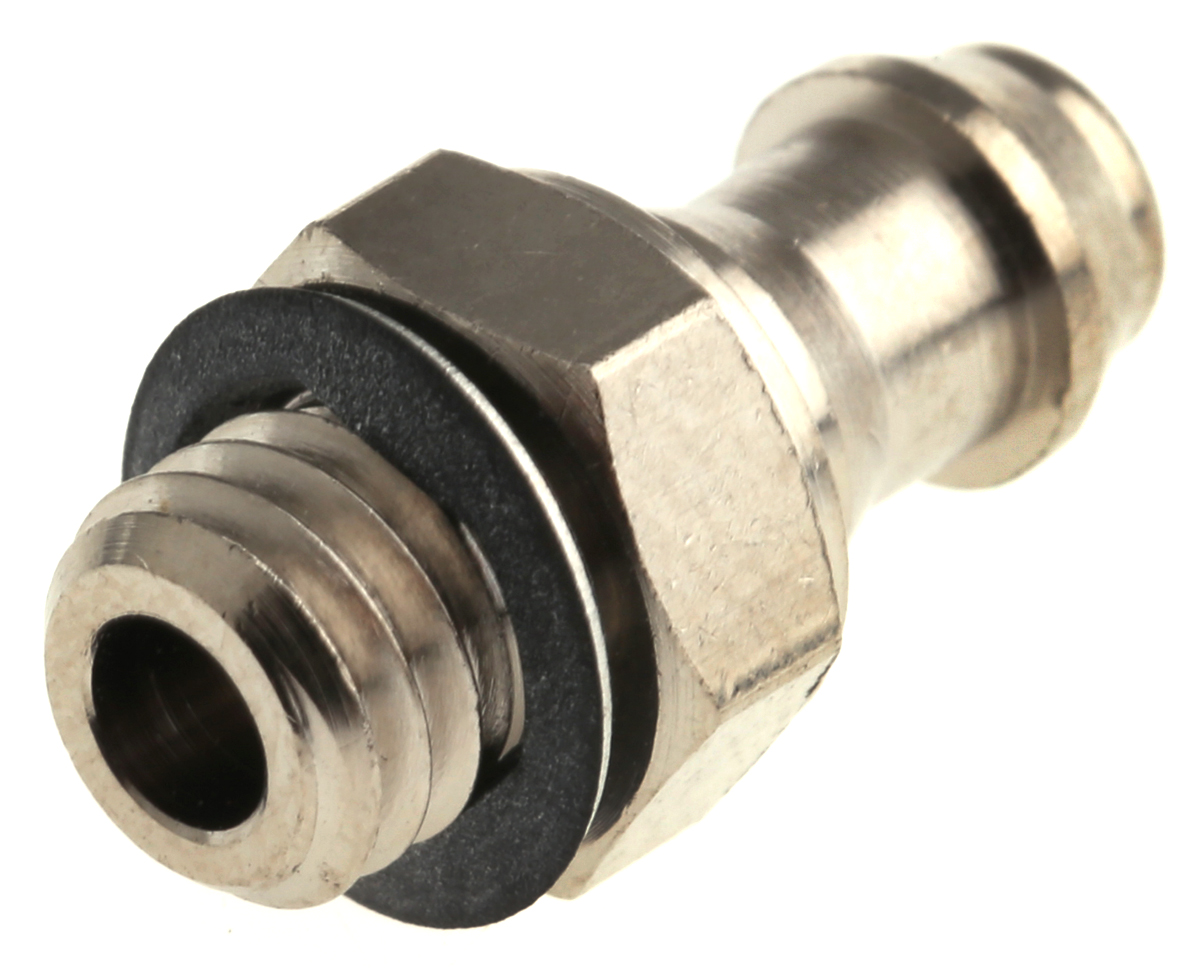 This is Pneumatic Straight Threaded-to-Tube Adapter M5 x 0.8 Male Barbed 6 mm manufactured by SMC. The manufacturer part number is M-5AU-6. A quality product with a nice nickel plated finish. It features 1 mpa maximum operating pressure. The product is available in inline configuration. While the connector B is push in 5 mm. The connector A is m5 male connector. Moreover, its thread is made up of nickel plated brass material . The threaded connection is m5 x 0.8 male. The product has a threaded-to-tube style. The product's body is nicely designed from nickel plated brass materials. The product has a m manufacturer series. The pneumatic fitting is a straight threaded adaptor.