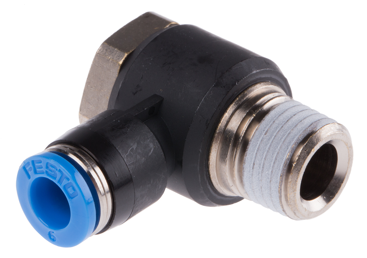 This is Pneumatic Elbow Threaded-to-Tube Adapter R 1/4 Male Push In 6 mm 6mm Tube Connection manufactured by Festo. The manufacturer part number is QSLV-1/4-6. It is designed for food grade no . It has a 90° angle . It features 14 bar maximum operating pressure. The product is available in inline configuration. While the connector B is push in 6 mm. Moreover, its thread is made up of nickel plated brass material . Whereas, the minimum operating temperature of the product is -10°c. The connector A is r 1/4 male connector. While it has 153088 of model number. The threaded connection is r 1/4 male. The product has a threaded-to-tube style. The product's body is nicely designed from pbt materials. The product has a qs manufacturer series. It is resistant to chemical no . The pneumatic fitting is a elbow threaded adaptor. It has a maximum operating temperature of +80°c. It includes a swivel connection .