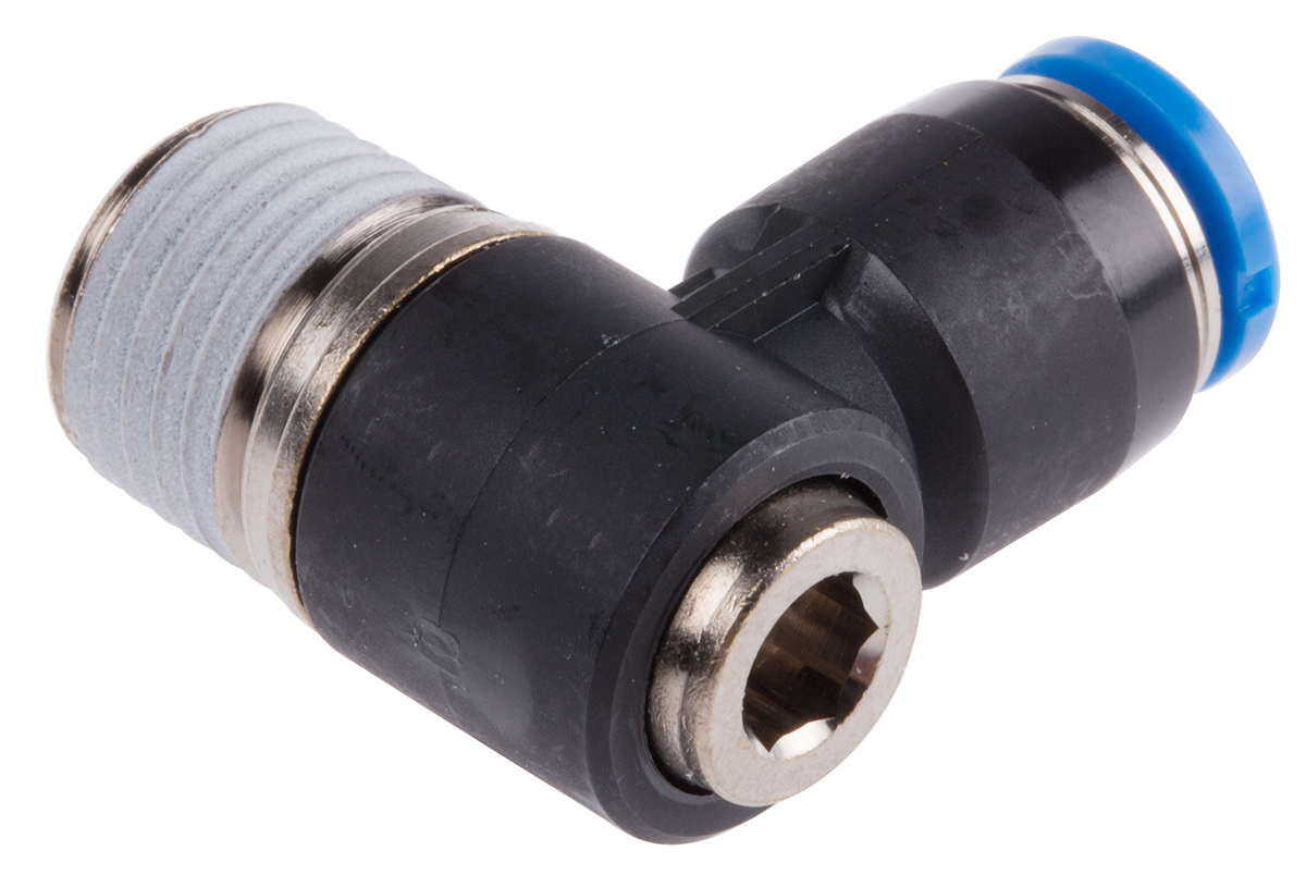 This is Pneumatic Elbow Threaded-to-Tube Adapter R 1/4 Male Push In 6 mm 6mm Tube Connection manufactured by Festo. The manufacturer part number is QSLV-1/4-6-I. It is designed for food grade no . It has a 90° angle . It features 14 bar maximum operating pressure. The product is available in inline configuration. While the connector B is push in 6 mm. Moreover, its thread is made up of nickel plated brass material . Whereas, the minimum operating temperature of the product is -10°c. The connector A is r 1/4 male connector. While it has 153098 of model number. The threaded connection is r 1/4 male. The product has a threaded-to-tube style. The product's body is nicely designed from pbt materials. The product has a qs manufacturer series. It is resistant to chemical no . The pneumatic fitting is a elbow threaded adaptor. It has a maximum operating temperature of +80°c. It includes a swivel connection .