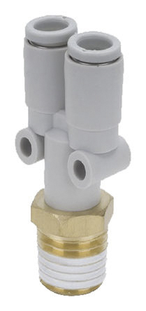 This is Brass Pneumatic Y Threaded-to-Tube Adapter Push In 8 mm manufactured by SMC. The manufacturer part number is KQ2U08-02AS. It features 3 (proof) mpa, 1 mpa maximum operating pressure. The product complies with all safety standards, such as iec 60204-1, iso 10218-1, iso 4413, iso 4414, rohs compliant. The product is available in inline configuration. While the connector B is push in 8 mm. The connector A is push in 8 mm connector. The threaded connection is r 1/4 male. The product has a threaded-to-tube style. The product's body is nicely designed from brass materials. The pneumatic fitting is a y threaded adaptor. It has a maximum operating temperature of 60°c. Whereas, the minimum operating temperature of the product is -5°c.