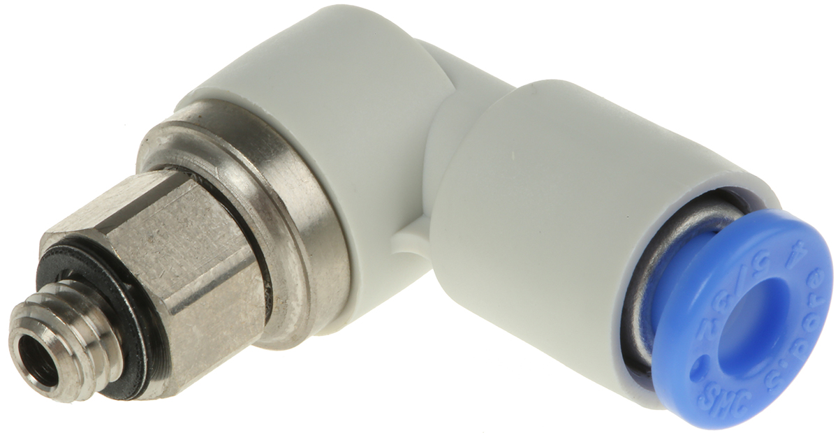 This is Rotary Adapter M5 x 0.8 Male Push In 4 mm manufactured by SMC. The manufacturer part number is KSL04-M5. It has a 90° angle . It features 1 mpa maximum operating pressure. While the connector B is push in 4 mm. The connector A is m5 male connector. Moreover, its thread is made up of nickel plated brass material . The threaded connection is m5 male. The product has a threaded-to-tube style. The product's body is nicely designed from pbt materials. The product has a ksl manufacturer series. Whereas, the minimum operating temperature of the product is -5°c. The pneumatic fitting is a elbow threaded adaptor. It has a maximum operating temperature of +60°c. It includes a swivel connection .