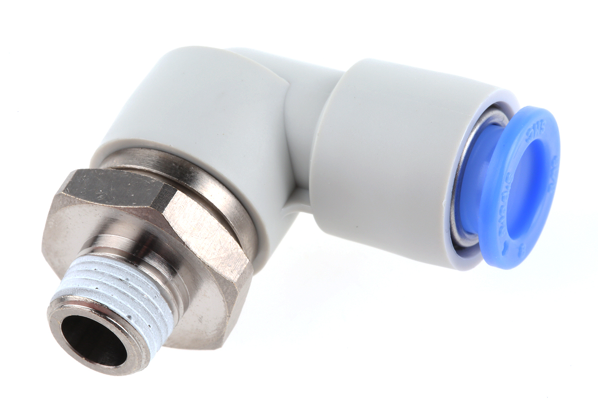 This is Rotary Adapter R 1/8 Male Push In 8 mm manufactured by SMC. The manufacturer part number is KSL08-01S. It has a 90° angle . It features 1 mpa maximum operating pressure. While the connector B is push in 8 mm. The connector A is r 1/8 male connector. Moreover, its thread is made up of brass material . The threaded connection is r 1/8 male. The product has a threaded-to-tube style. The product's body is nicely designed from pbt materials. The product has a ksl manufacturer series. Whereas, the minimum operating temperature of the product is -5°c. The pneumatic fitting is a elbow threaded adaptor. It has a maximum operating temperature of +60°c. It includes a swivel connection .