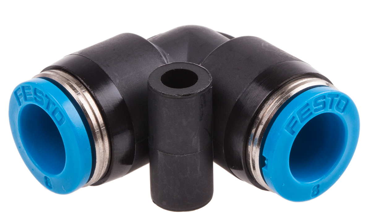 This is Pneumatic Elbow Tube-to-Tube Adapter Push In 8 mm to Push In 8 mm manufactured by Festo. The manufacturer part number is QSL-8. It features 14 bar maximum operating pressure. It is designed for food grade no . It has a 90° angle . The product complies with all safety standards, such as rohs compliant. The product is available in inline configuration. While the connector B is push in 8 mm. Moreover, its thread is made up of nickel plated brass material . Whereas, the minimum operating temperature of the product is -10°c. The connector A is push in 8 mm connector. While it has 153072 of model number. The product has a tube-to-tube style. The product's body is nicely designed from pbt materials. The product has a qsl manufacturer series. It is resistant to chemical no . The pneumatic fitting is a elbow tube-totube adaptor. It has a maximum operating temperature of +80°c. It includes a swivel connection .