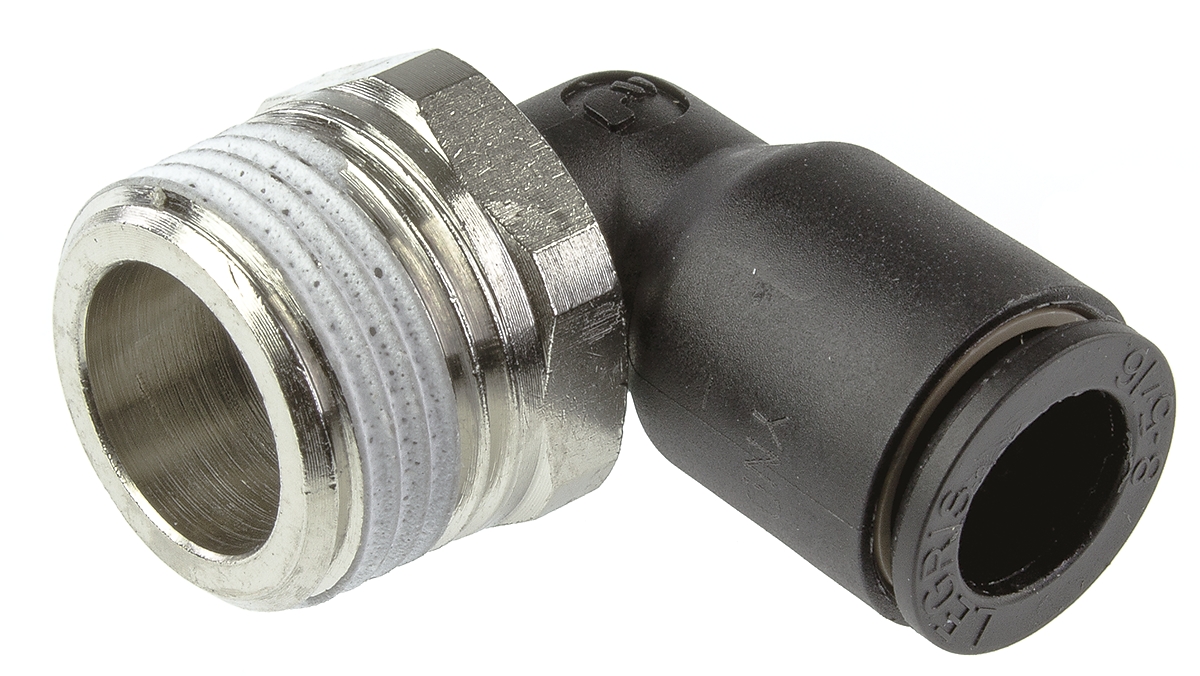 This is Pneumatic Elbow Threaded-to-Tube Adapter R 3/8 Male Push In 8 mm manufactured by Legris. The manufacturer part number is 3109 08 17. It has a 90° angle . It features 20 bar maximum operating pressure. The product is available in inline configuration. While the connector B is push in 8 mm. Whereas, the minimum operating temperature of the product is -20°c. The connector A is r 3/8 male connector. Moreover, its thread is made up of nickel plated brass material . The threaded connection is r 3/8 male. The product has a threaded-to-tube style. The product's body is nicely designed from glass reinforced nylon materials. The product has a lf3000 manufacturer series. The pneumatic fitting is a elbow threaded adaptor. It has a maximum operating temperature of +80°c. It includes a swivel connection .