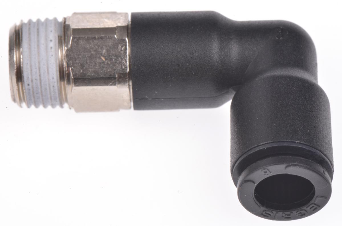 This is Pneumatic Elbow Threaded-to-Tube Adapter R 1/8 Male Push In 6 mm manufactured by Legris. The manufacturer part number is 3129 06 10. It has a 90° angle . It features 20 bar maximum operating pressure. The product is available in inline configuration. While the connector B is push in 6 mm. The connector A is r 1/8 male connector. Moreover, its thread is made up of nickel plated brass material . The threaded connection is r 1/8 male. The product has a threaded-to-tube style. The product's body is nicely designed from glass reinforced nylon materials. The product has a lf3000 manufacturer series. Whereas, the minimum operating temperature of the product is -20°c. The pneumatic fitting is a elbow threaded adaptor. It has a maximum operating temperature of +80°c. It includes a swivel connection .