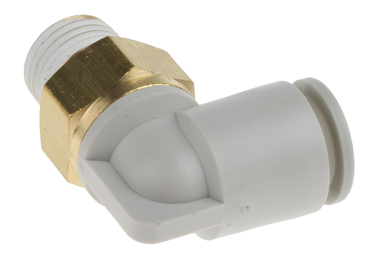 This is Pneumatic Elbow Threaded-to-Tube Adapter R 1/4 Male Push In 10 mm manufactured by SMC. The manufacturer part number is KQ2L10-02AS. It has a 90° angle . While the connector B is push in 10 mm. The connector A is r 1/4 male connector. Moreover, its thread is made up of brass material . The threaded connection is r 1/4 male. The product has a threaded-to-tube style. The product's body is nicely designed from pbt materials. The product has a kq2 manufacturer series. Whereas, the minimum operating temperature of the product is -5°c. The pneumatic fitting is a elbow threaded adaptor. It has a maximum operating temperature of +60°c. It includes a swivel connection .