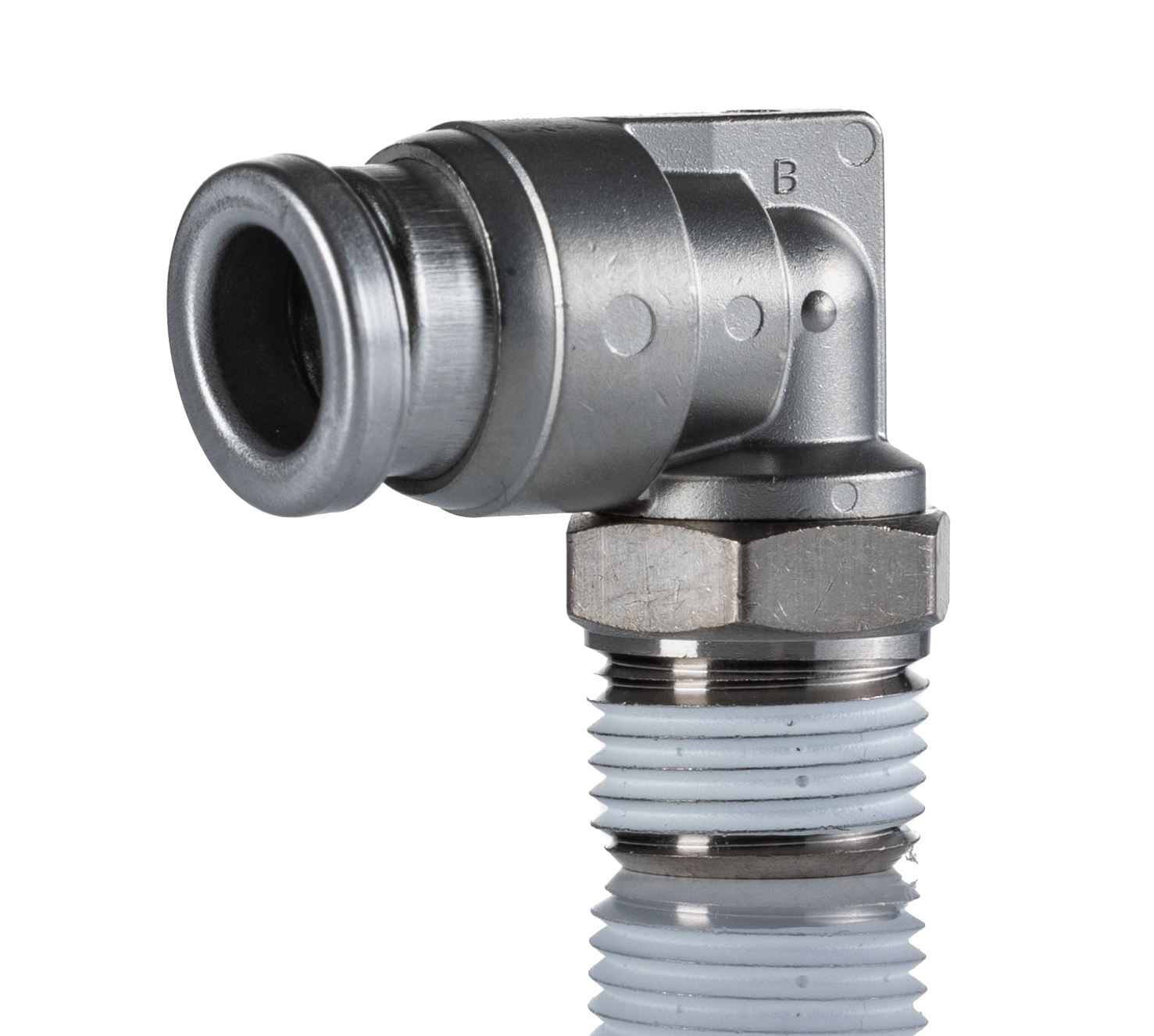 This is Pneumatic Elbow Threaded-to-Tube Adapter NPT 1/8 Male Push In 1/4 in manufactured by SMC. The manufacturer part number is KQB2L07-N01S. It has a 90° angle . It features 1 mpa maximum operating pressure. While the connector B is push in 1/4 in. The connector A is npt 1/8 male connector. The threaded connection is npt 1/8 male. The product has a threaded-to-tube style. The product's body is nicely designed from nickel plated brass materials. The product has a kqb2 manufacturer series. Whereas, the minimum operating temperature of the product is -5°c. The pneumatic fitting is a elbow threaded adaptor. It has a maximum operating temperature of +150°c. It includes a swivel connection .