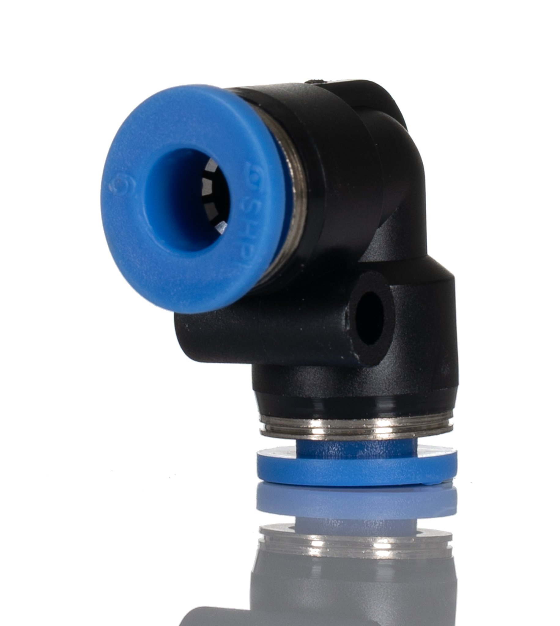 This is Pneumatic Elbow Tube-to-Tube Adapter Push In 6 mm to Push In 6 mm manufactured by RS Pro. The manufacturer part number is 916-0883. A quality product with a nice nickel plated finish. It features 10 bar maximum operating pressure. While the connector B is push in 6 mm. The connector A is push in 6 mm connector. The pneumatic fitting is a elbow tube-totube adaptor. The product's body is nicely designed from polyoxymethylene materials. Whereas, the minimum operating temperature of the product is 0°c. The product has a tube-to-tube style. It has a maximum operating temperature of +60°c.