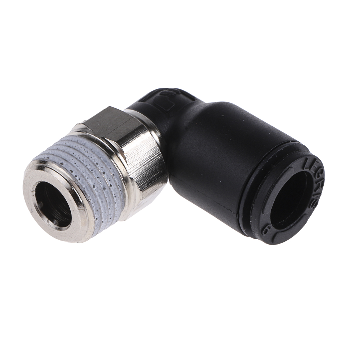 This is Pneumatic Elbow Threaded-to-Tube Adapter R 1/8 Male Push In 6 mm manufactured by Legris. The manufacturer part number is 3109 06 10. It has a 90° angle . It features 20 bar maximum operating pressure. The product is available in inline configuration. While the connector B is push in 6 mm. Whereas, the minimum operating temperature of the product is -20°c. The connector A is r 1/8 male connector. Moreover, its thread is made up of nickel plated brass material . The threaded connection is r 1/8 male. The product has a threaded-to-tube style. The product's body is nicely designed from glass reinforced nylon materials. The product has a lf3000 manufacturer series. The pneumatic fitting is a elbow threaded adaptor. It has a maximum operating temperature of +80°c. It includes a swivel connection .