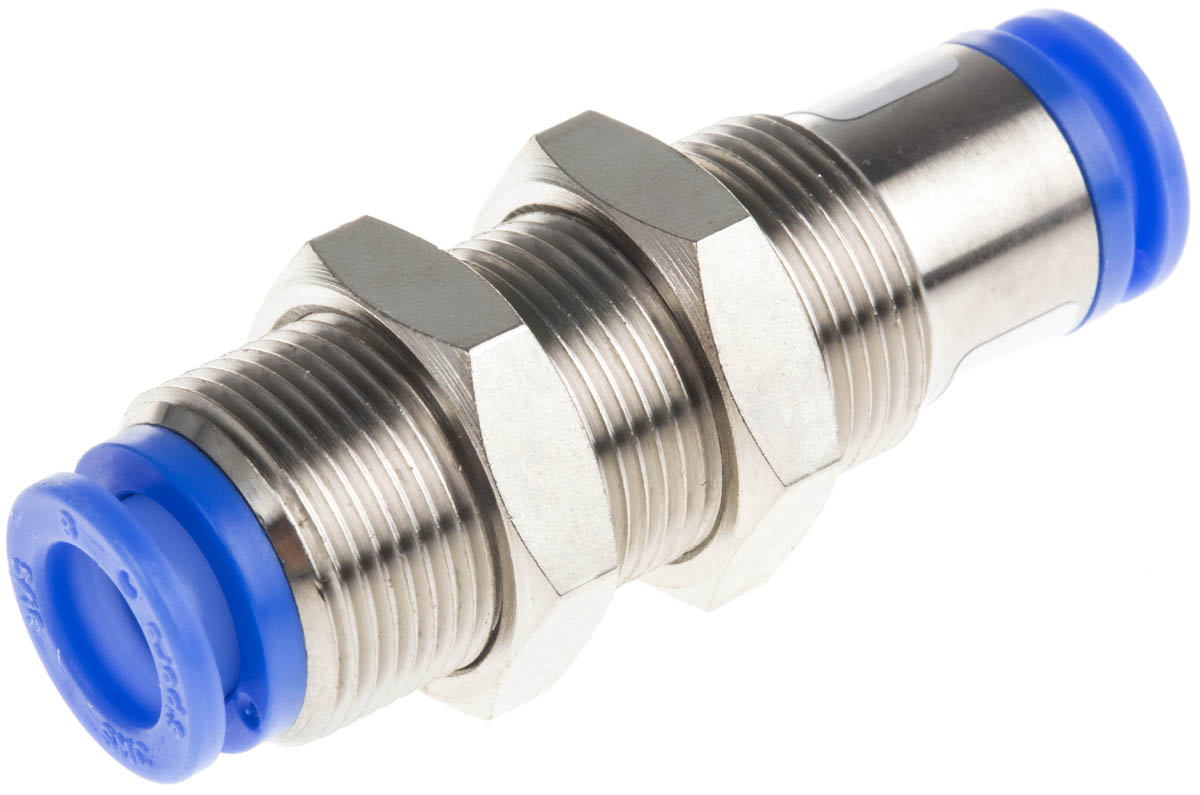 This is Pneumatic Bulkhead Tube-to-Tube Adapter Straight Push In 8 mm to Push In 8 mm manufactured by SMC. The manufacturer part number is KCE08-00. A quality product with a nice nickel plated finish. Whereas, the minimum operating temperature of the product is -5°c. It features 1 mpa maximum operating pressure. While the connector B is push in 8 mm. The connector A is push in 8 mm connector. The product has a tube-to-tube style. The given diameter of mounting hole is 17mm. The product's body is nicely designed from nickel plated brass materials. The product has a kc manufacturer series. The pneumatic fitting is a bulkhead tube-to-tube adaptor. It has a maximum operating temperature of +60°c.