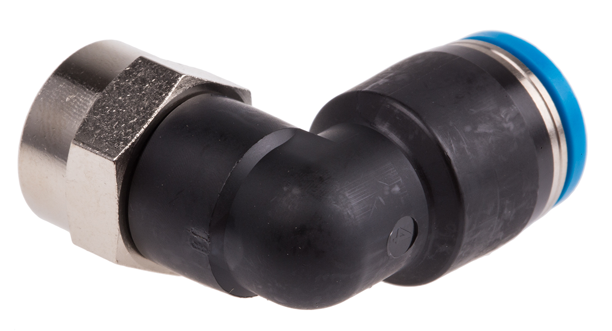 This is Pneumatic Elbow Threaded-to-Tube Adapter G 1/8 Female Push In 8 mm 8mm Tube Connection manufactured by Festo. The manufacturer part number is QSLF-1/8-8-B. It is designed for food grade no . It has a 90° angle . It features 14 bar maximum operating pressure. The product is available in inline configuration. While the connector B is push in 8 mm. Moreover, its thread is made up of nickel plated brass material . Whereas, the minimum operating temperature of the product is -10°c. The connector A is g 1/8 female connector. While it has 153276 of model number. The threaded connection is g 1/8 female. The product has a threaded-to-tube style. The product's body is nicely designed from pbt materials. The product has a qs manufacturer series. It is resistant to chemical no . The pneumatic fitting is a elbow threaded adaptor. It has a maximum operating temperature of +80°c. It includes a swivel connection .