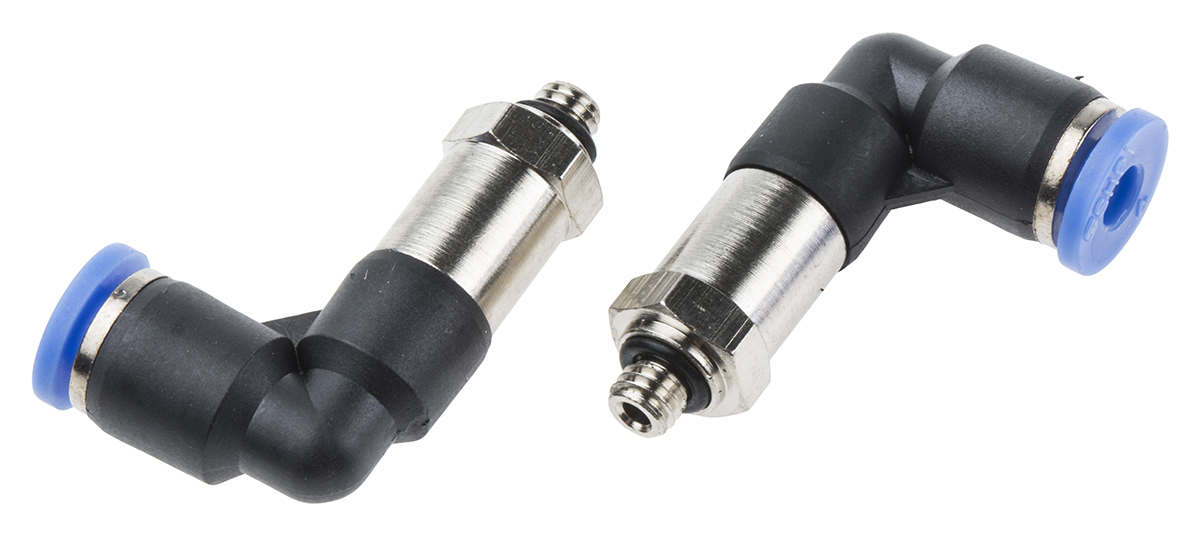 This is Pneumatic Elbow Threaded-to-Tube Adapter M5 x 0.8 4mm Tube Connection manufactured by RS Pro. The manufacturer part number is 916-0754. It features 10 bar maximum operating pressure. While the connector B is push in 4 mm. The connector A is m5 male connector. Moreover, its thread is made up of nickel plated brass material . The threaded connection is m5 male. The product has a threaded-to-tube style. The product's body is nicely designed from polyoxymethylene materials. Whereas, the minimum operating temperature of the product is 0°c. The pneumatic fitting is a elbow threaded adaptor. It has a maximum operating temperature of +60°c. It includes a swivel connection .