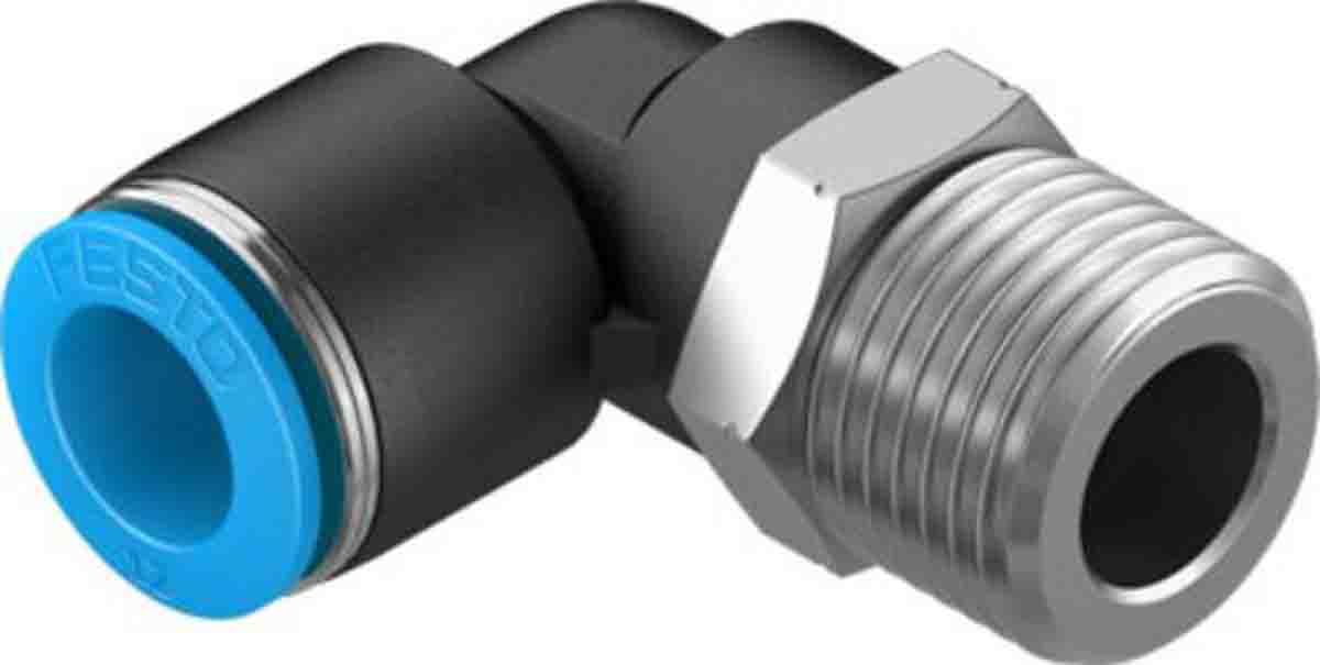 This is Threaded-to-Tube Pneumatic Elbow Threaded-to-Tube Adapter manufactured by Festo. The manufacturer part number is QSL-1/2-12-20. While the connector B is push in 12 mm. The connector A is r 1/2 male connector. While it has 130738 of model number. The pneumatic fitting is a elbow threaded adaptor. The product has a threaded-to-tube style.