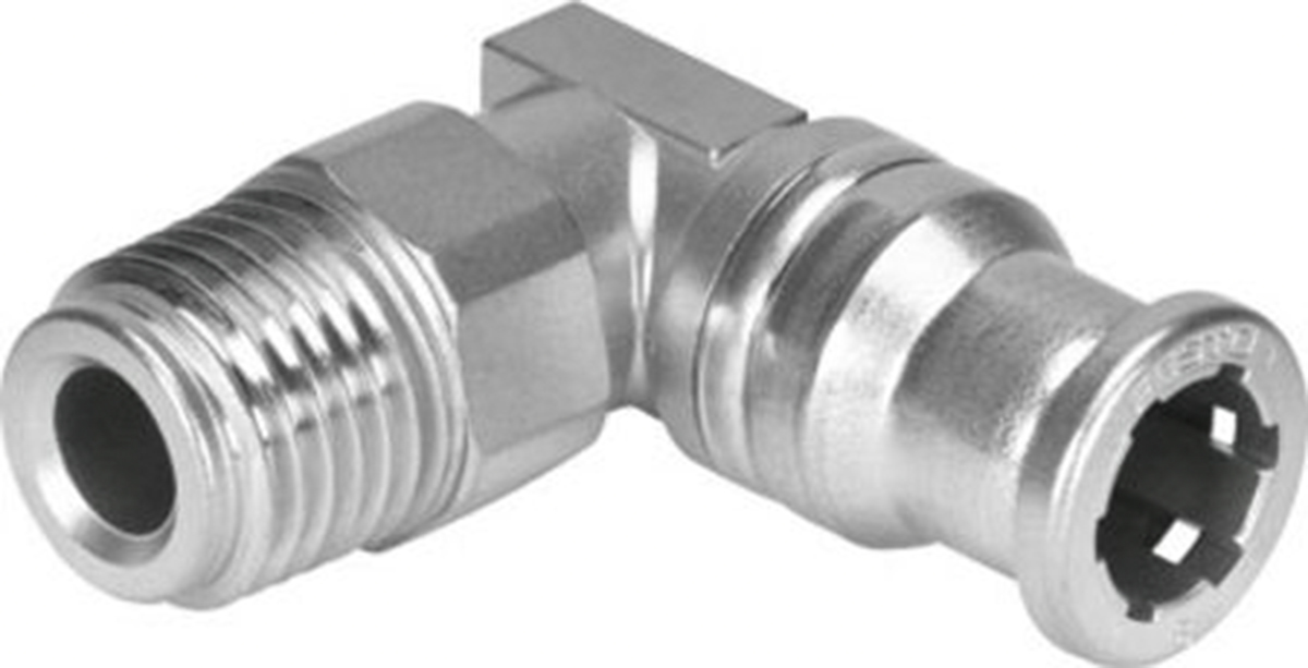 This is Pneumatic Elbow Threaded Adapter R 3/8 Male x R 3/8 Male Male manufactured by Festo. The manufacturer part number is CRQSL-3/8-12. While the connector B is r 3/8 male. The connector A is r 3/8 male connector. While it has 162877 of model number. The product has a threaded style. The product has a crqsl manufacturer series. The pneumatic fitting is a elbow threaded adaptor.