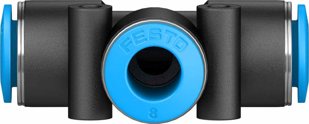 This is push-in T-connector manufactured by Festo. The manufacturer part number is QST-8-50. The connector A is push in 8 mm connector. It has a 90° angle . The product complies with all safety standards, such as rohs compliant. It features 6 bar maximum operating pressure. While the connector B is push in 8 mm. It is designed for food grade no . While it has 130804 of model number. The product has a tube-to-tube style. The product's body is nicely designed from pbt materials. The product has a qst-8-50 manufacturer series. Whereas, the minimum operating temperature of the product is -10°c. It is resistant to chemical no . The pneumatic fitting is a tee tube-to-tube adaptor. It has a maximum operating temperature of +80°c.