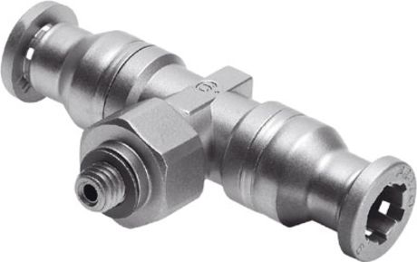 This is Threaded-to-Tube Pneumatic Fitting Push In 6 mm x Push In 6 mm x M5 Male 10 bar manufactured by Festo. The manufacturer part number is CRQST-M5-6. It features 10 bar maximum operating pressure. While the connector B is push in 6 mm. The connector A is push in 6 mm connector. While it has 164201 of model number. The product has a threaded-to-tube style. The threaded connection is m5 male. The pneumatic fitting is a tee threaded adaptor.