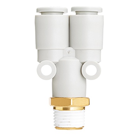 This is KQ2U Series Y Fitting Push In 12 mm to Push In 12 mm Threaded-to-Tube Connection Style manufactured by SMC. The manufacturer part number is KQ2U12-03AS. While the connector B is push in 12 mm. The connector A is push in 12 mm connector. The product has a threaded-to-tube style. The threaded connection is r 3/8 male. The product has a kq2u manufacturer series. The pneumatic fitting is a y fitting.