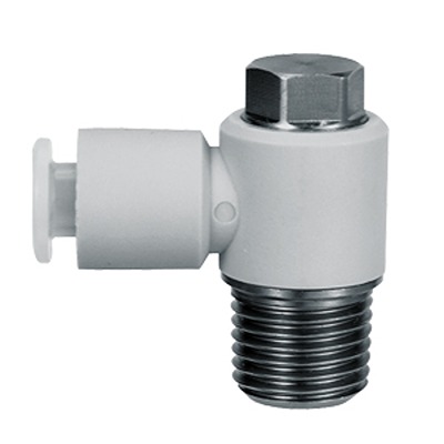 This is KGV Series Elbow Fitting 6 mm to R 1/8 Threaded-to-Tube Connection Style manufactured by SMC. The manufacturer part number is KGV06-01S. While the connector B is r 1/8. The connector A is 6 mm connector. While it has kgv06-01s of model number. The product has a threaded-to-tube style. The threaded connection is r 1/8. The product has a kgv manufacturer series. The pneumatic fitting is a elbow fitting.