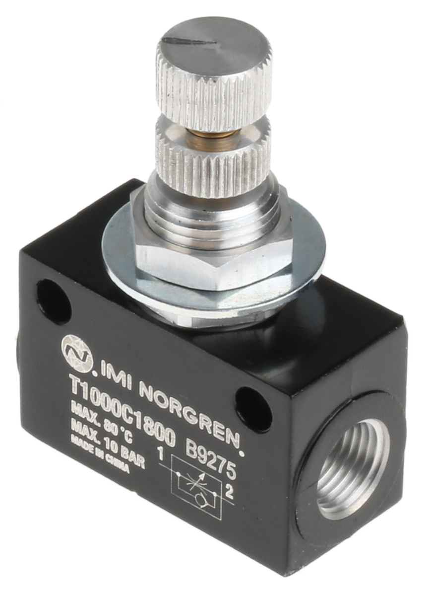 This is T1000 Series Flow Regulator G 1/8 Female Inlet Port x G 1/8 Female Outlet Port manufactured by Norgren. The manufacturer part number is T1000C1800. It has a maximum 10bar outlet pressure . The product has a threaded inlet of 1/8 in thread size . It has a/an g 1/8 female threaded outlet port . It comes in flow controller configuration. In addition, its threaded outlet is of g thread standard . The product has a minimum 1bar outlet pressure . It has a threaded type inlet port . In addition, it has a threaded outlet about 1/8 in thread size . The product's body is nicely designed from aluminium alloy materials. Moreover, it has a threaded inlet thread of female gender . The product has a t1000 manufacturer series. It has a threaded outlet of female thread gender . It has a/an g 1/8 female threaded inlet port . It is designed with a threaded type outlet port . It has a threaded inlet of g thread standard .