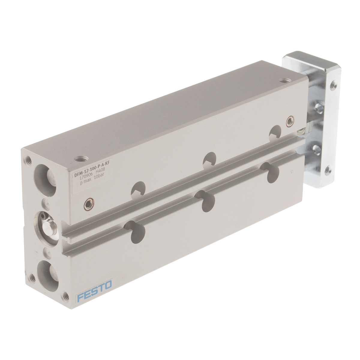 This is Pneumatic Guided Cylinder manufactured by Festo. The manufacturer part number is DFM-12-100-P-A-KF. While the product has supplied with elastomer cushioning. The given dimensions of the product include 155 x 60 x 28mm. The typical product's weight is 723g. While it has 170906 of model number. The stroke is 100mm. In addition, the height is 28mm. Furthermore, the product is 60mm wide. Its accurate length is 155mm. The product has a dfm manufacturer series. Concerning its action options, it allows double action. The bore with 12mm of dimensions. It features 10 bar maximum operating pressure. It has a maximum operating temperature of +60°c. Whereas, the minimum operating temperature of the product is -5°c.