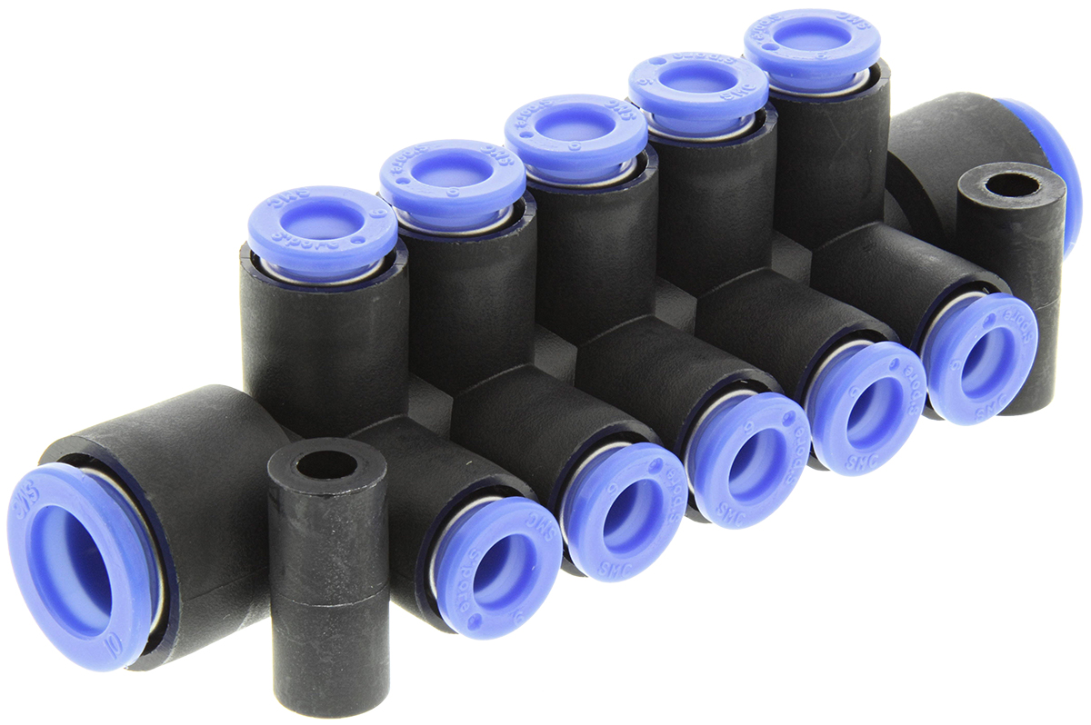 This is 10 Outlet Ports PBT Pneumatic Manifold Tube-to-Tube Fitting Push In 6 mm manufactured by SMC. The manufacturer part number is KM11-06-10-10. In addition, it has 10mm inlet port tube size . It features 1 mpa maximum operating pressure. Moreover, it has a standard push in 6 mm outlet port . It includes 1 inlet ports . The product is made from highly stable and reliable pbt. The product has a tube-to-tube style. Whereas, it has an outlet port of push in type connection . It has a standard push in 10 mm inlet port . The product has a km manufacturer series. Whereas, the minimum operating temperature of the product is -5°c. It has outlet port of 6mm tube size . It has an inlet port push in type connection . In addition, the number of outlet ports included is/are 10 . It has a maximum operating temperature of +60°c.