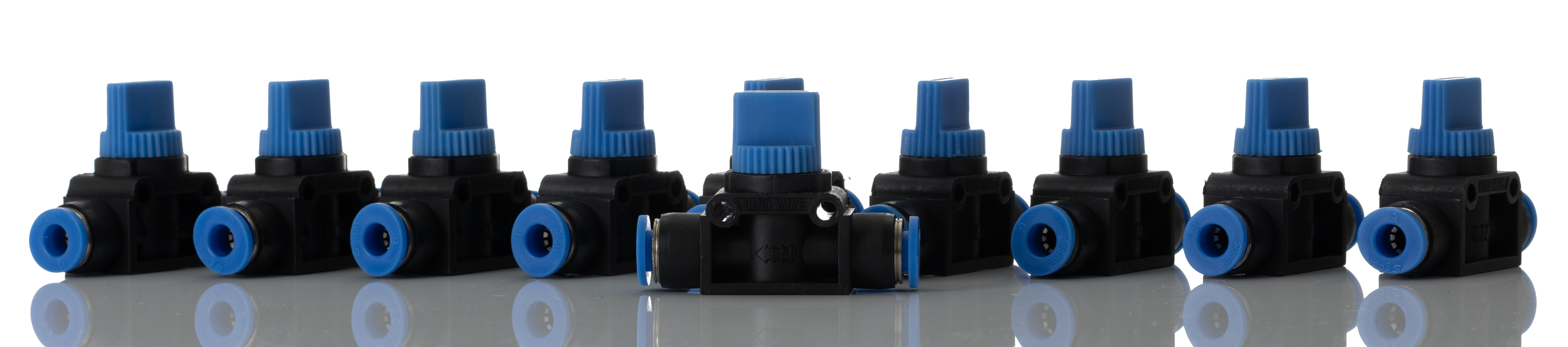 This is HVFF Series Blue Rotary Knob Pneumatic Manual Control Valve Polyoxymethylene 6mm manufactured by RS Pro. The manufacturer part number is 916-0968. It performs basic function of pneumatic relay. It has a blue control button/switch colour . It features 10 bars maximum operating pressure. While it has iii b of model number. It has a typical thread size of 6mm. This product features 2 number of ports. The product's body is nicely designed from polyoxymethylene materials. The product has a hvff manufacturer series. Whereas, the minimum operating temperature of the product is 0°c. It is created with a rotary knob control mechanism . It has a maximum operating temperature of +60°c. The product carries possible position value of 2.