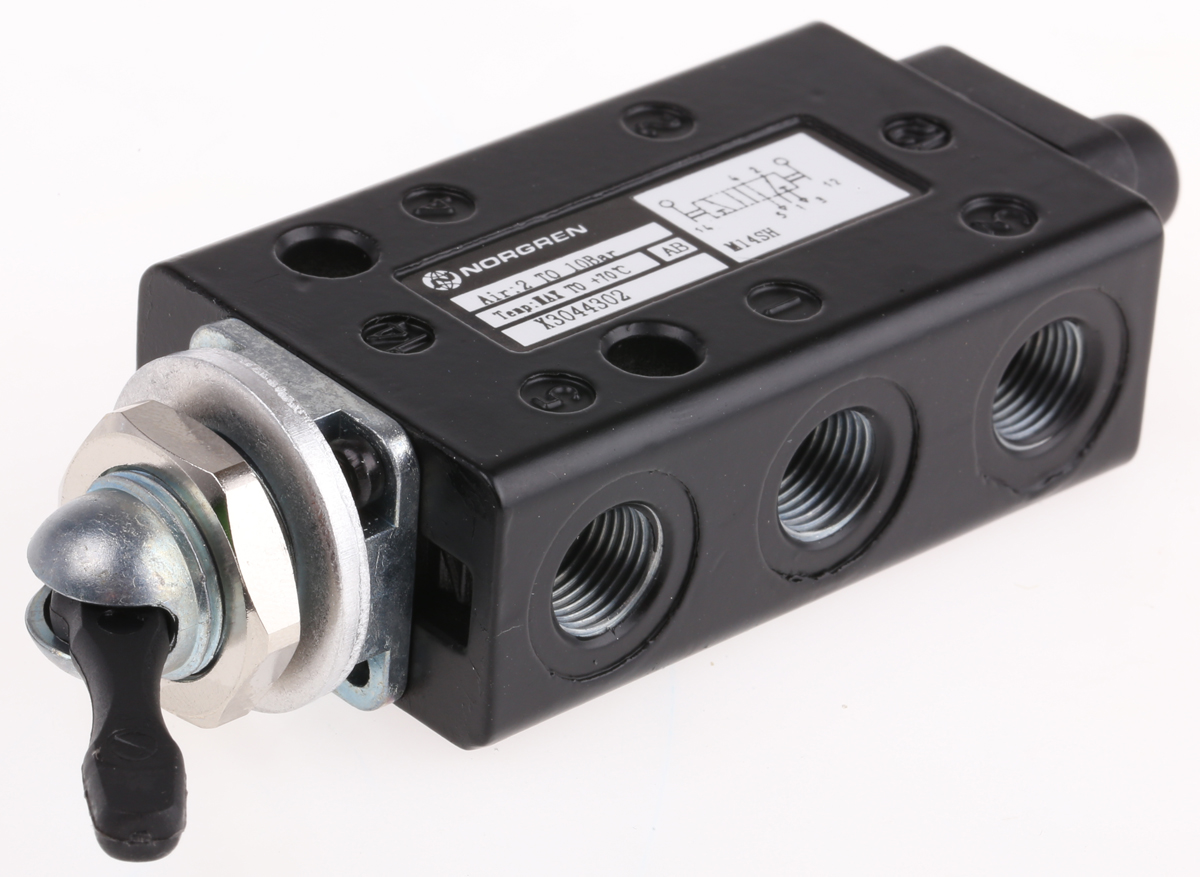 This is X30 Series Black Toggle Pneumatic Manual Control Valve G 1/8 Zinc Alloy 1/8 in G 0 → +70°C manufactured by Norgren. The manufacturer part number is X3044302. It performs basic function of 5/2. It has a black control button/switch colour . It features 10 bar maximum operating pressure. The product provides up to 335l/min maximum flow rate. The threaded is a g standard. It also features g 1/8 connection port thread. It has a typical thread size of 1/8in. This product features 5 number of ports. The product's body is nicely designed from zinc alloy materials. The product has a x30 manufacturer series. Whereas, the minimum operating temperature of the product is 0°c. It is created with a toggle control mechanism . It has a maximum operating temperature of +70°c. The product carries possible position value of 2.