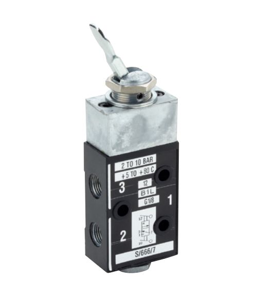 This is Lever 3/2 Mechanical Valve Martonair Series G 1/8 1/8 manufactured by Norgren. The manufacturer part number is S/666/7. It performs basic function of 3/2. It features 10 bar maximum operating pressure. The product provides up to 174l/min maximum flow rate. The threaded is a g standard. It also features g 1/8 connection port thread. While it has s/666/7 of model number. It has a typical thread size of 1/8. This product features 3 number of ports. The product's body is nicely designed from die cast zinc alloy materials. The product has a martonair manufacturer series. Whereas, the minimum operating temperature of the product is -20°c. It is created with a lever control mechanism . It has a maximum operating temperature of +80°c. The product carries possible position value of 2.