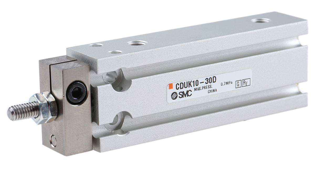 This is Pneumatic Multi-Mount Cylinder CUK Series Double Action Single Rod 10mm Bore 30mm stroke manufactured by SMC. The manufacturer part number is CDUK10-30D. Provides m5 x 0.8 of port connection. While the product has supplied with rubber cushioning. The given dimensions of the product include 87 x 15 x 24mm. The typical product's weight is 63g. Its accurate length is 87mm. In addition, the height is 24mm. Furthermore, the product is 15mm wide. The stroke is 30mm. It features 0.7 mpa maximum operating pressure. The product has a cuk manufacturer series. Concerning its action options, it allows double action. The bore with 10mm of dimensions. Moreover, it has an absolute maximum 1.05mpa pressure . It has a maximum operating temperature of +70°c. Whereas, the minimum operating temperature of the product is -10°c.