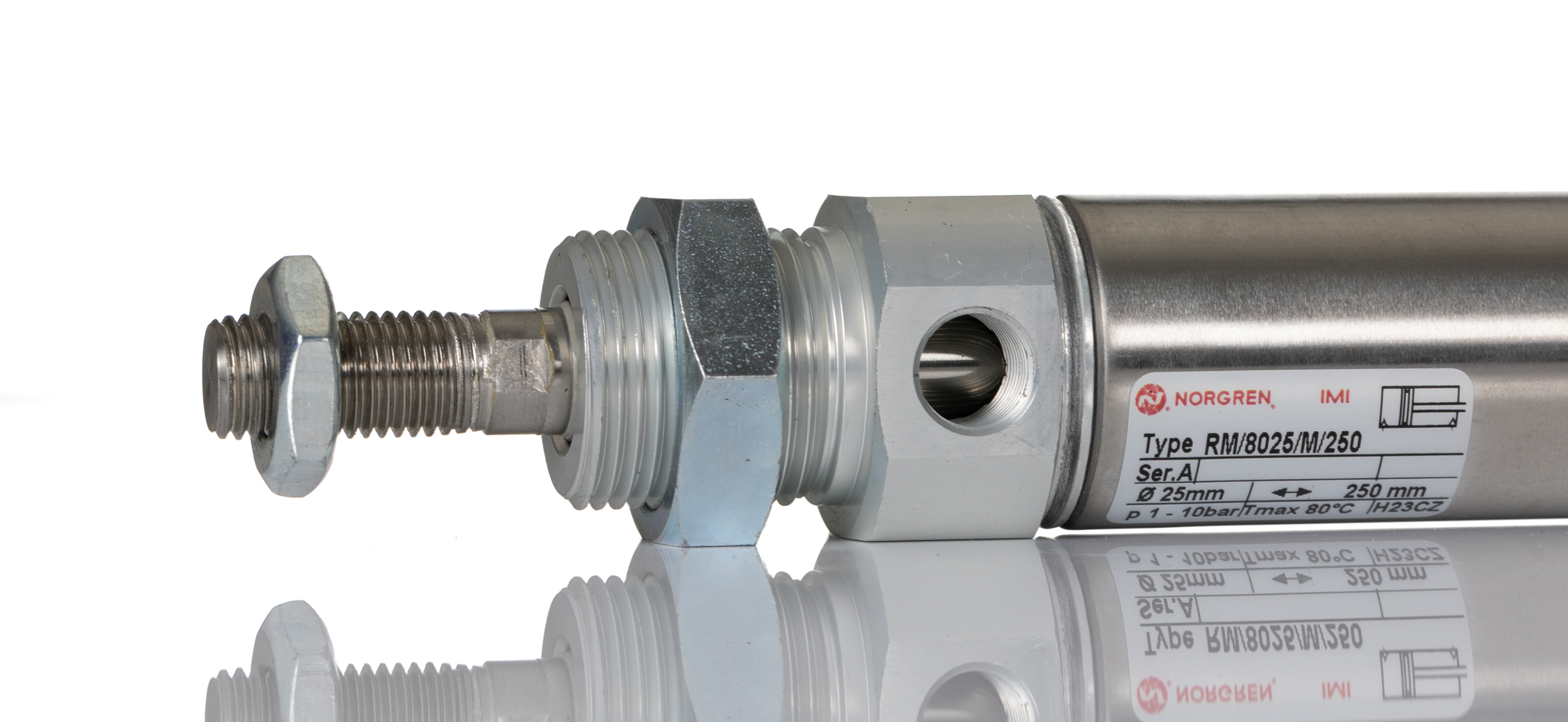 This is Pneumatic Roundline Cylinder 25mm Bore 250mm Stroke RM/8000/M Series Double Acting manufactured by IMI Norgren. The manufacturer part number is RM/8025/M/250. Its diameter is 30mm. While the product has supplied with buffer cushioning. It features 10 bar maximum operating pressure. The typical product's weight is 480g. While it has rm/8000 of model number. Its accurate length is 385mm. It includes an attractive g 1/8 pneumatic connection . Its test weight is 185 (at 0 mm stroke) g . The stroke is 250mm. The product has a rm/8000/m manufacturer series. It complies with iso 6432 ISO standard . Concerning its action options, it allows double action. The bore with 25mm of dimensions. Moreover, its stroke interval weight is 28 (at 25 mm stroke) g . It has a maximum operating temperature of +80°c. Whereas, the minimum operating temperature of the product is -10°c.