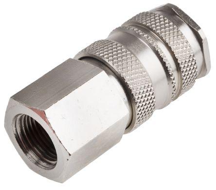 This is Brass Pneumatic Quick Connect Coupling G 3/8 Female Threaded manufactured by RS Pro. The manufacturer part number is 027 DG 17. It has a female gender thread . A quality product with a nice nickel plated finish. It features 35 bar maximum operating pressure. The threaded is a g standard. The product is made from highly stable and reliable brass. It complies with cejn 410, rectus 27, tst 410 connection standard . It coupling is of female gender . It has a typical thread size of 3/8 in. The threaded connection is g 3/8 female. The product has a 27 manufacturer series. Whereas, the minimum operating temperature of the product is -20°c. Its seal is made using nitrile rubber material . It has a maximum operating temperature of +100°c. It allows threaded connection type.