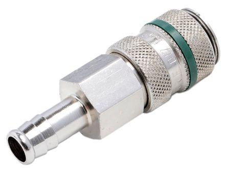 This is Brass Pneumatic Quick Connect Coupling Hose Barb 10mm Hose Barb Connection manufactured by RS Pro. The manufacturer part number is 017 HG 10. It has a male gender thread . A quality product with a nice nickel plated finish. It features 35 bar maximum operating pressure. It has a standard 10mm hose barb connection . The product is made from highly stable and reliable brass. It complies with rectus 17, schrader nw5 connection standard . It coupling is of male gender . The product has a 17 manufacturer series. Whereas, the minimum operating temperature of the product is -20°c. Its seal is made using nitrile rubber material . It has a maximum operating temperature of +100°c. It allows hose barb connection type.