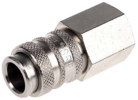 This is Brass Pneumatic Quick Connect Coupling G 1/4 Female Threaded manufactured by RS Pro. The manufacturer part number is 021 DG 13N. It has a female gender thread . A quality product with a nice nickel plated finish. It features 35 bar maximum operating pressure. The threaded is a g standard. The product is made from highly stable and reliable brass. It complies with camozzi, legris, rectus 21, rectus 90 connection standard . It coupling is of female gender . It has a typical thread size of 1/4 in. The threaded connection is g 1/4 female. The product has a 21 manufacturer series. Whereas, the minimum operating temperature of the product is -20°c. Its seal is made using nitrile rubber material . It has a maximum operating temperature of +100°c. It allows threaded connection type.