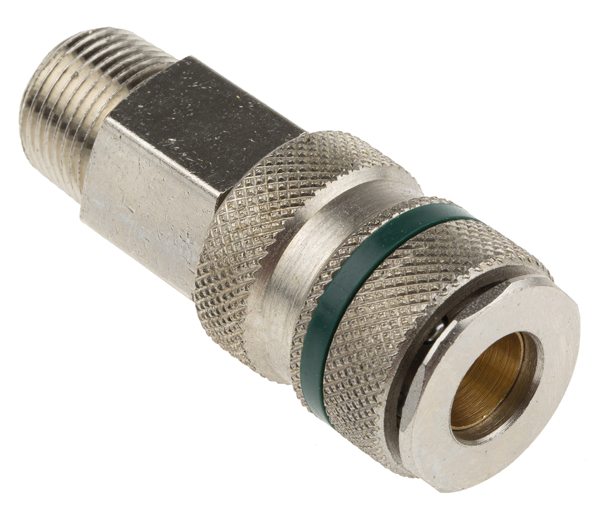 This is Brass Steel Pneumatic Quick Connect Coupling R 3/8 Male Threaded manufactured by RS Pro. The manufacturer part number is 667-1699. It has a male gender thread . A quality product with a nice nickel plated finish. It features 35bar maximum operating pressure. The threaded is a r standard. The product is made from highly stable and reliable brass, steel. It complies with rectus 17, schrader nw5 connection standard . It coupling is of male gender . It has a typical thread size of 3/8in. The threaded connection is r 3/8 male. The product has a 17 manufacturer series. Whereas, the minimum operating temperature of the product is -20°c. Its seal is made using nitrile rubber material . It has a maximum operating temperature of +100°c. It allows threaded connection type.