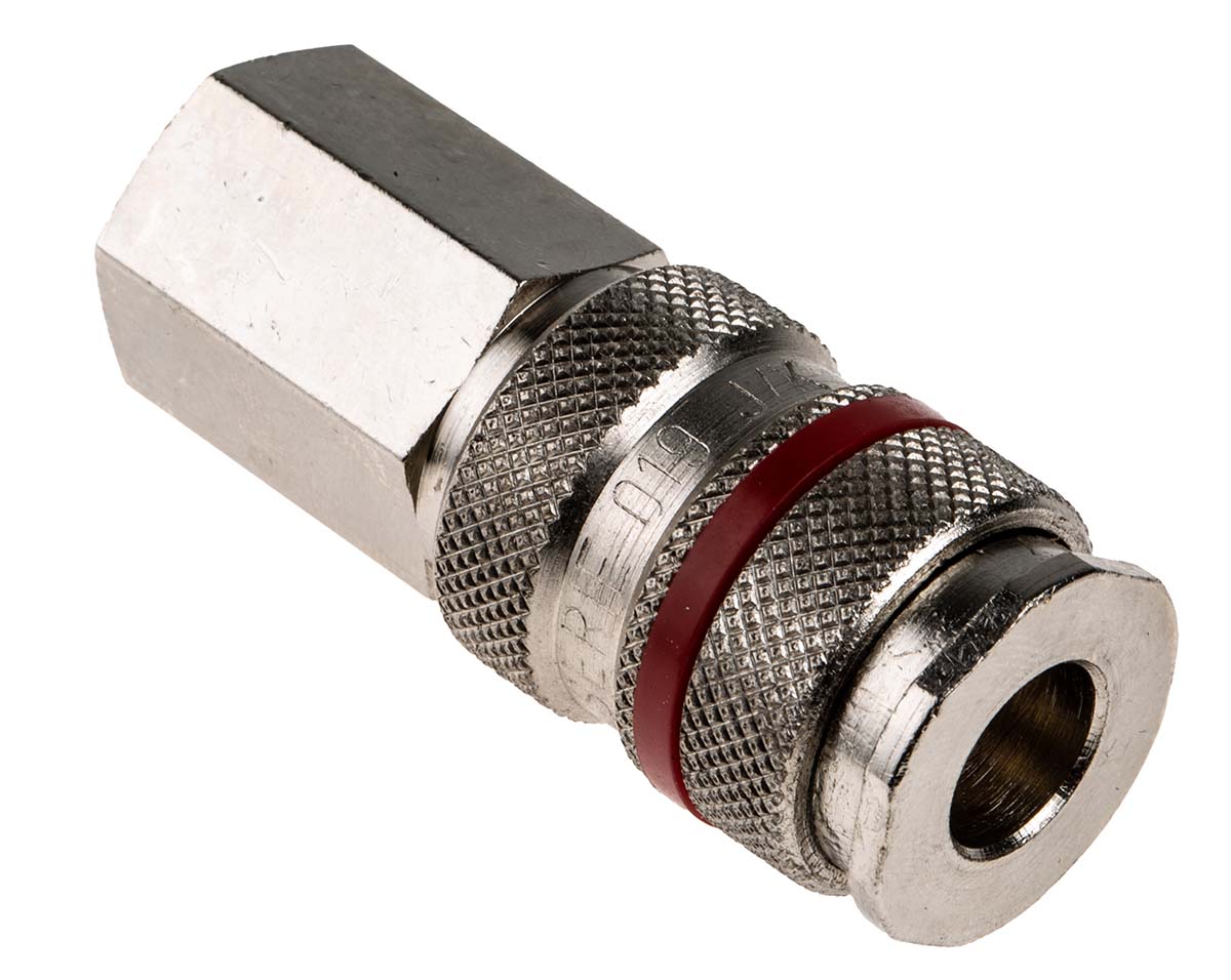 This is Brass Pneumatic Quick Connect Coupling G 1/4 Female Threaded manufactured by RS Pro. The manufacturer part number is 667-1728. It has a female gender thread . A quality product with a nice nickel plated finish. It features 35bar maximum operating pressure. The threaded is a g standard. The product is made from highly stable and reliable brass. It complies with plc 60, rectus 19 connection standard . The threaded connection is g 1/4 female. It coupling is of female gender . It has a typical thread size of 1/4in. Its coupling type is quick connect coupling socket . The product has a 19 manufacturer series. Whereas, the minimum operating temperature of the product is -20°c. Its seal is made using nitrile rubber material . It has a maximum operating temperature of +100°c. It allows threaded connection type.