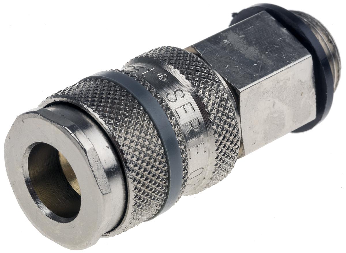 This is Brass Pneumatic Quick Connect Coupling R 3/8 Male Threaded manufactured by RS Pro. The manufacturer part number is 667-1872. It has a male gender thread . A quality product with a nice nickel plated finish. It features 35bar maximum operating pressure. The threaded is a r standard. The product is made from highly stable and reliable brass. It complies with cejn 310, forster, hansen 3000, parker pbf 1/4, rectus 23, tst 024 atlas copco qic 08, us mil specc 4109 1/4 connection standard . It coupling is of male gender . It has a typical thread size of 3/8in. The threaded connection is r 3/8 male. The product has a 23 manufacturer series. Whereas, the minimum operating temperature of the product is -20°c. Its seal is made using nitrile rubber material . It has a maximum operating temperature of +100°c. It allows threaded connection type.