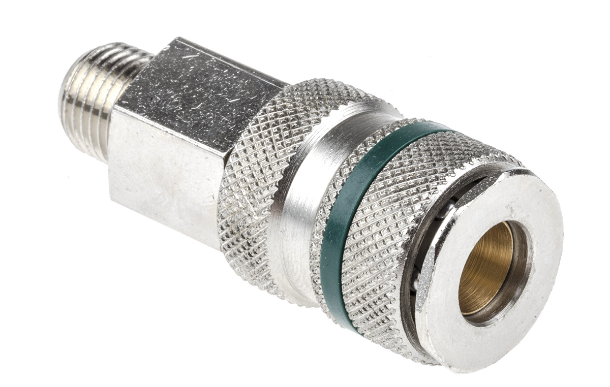 This is Brass Steel Pneumatic Quick Connect Coupling R 1/4 Male Threaded manufactured by RS Pro. The manufacturer part number is 667-1695. It has a male gender thread . A quality product with a nice nickel plated finish. It features 35bar maximum operating pressure. The threaded is a r standard. The product is made from highly stable and reliable brass, steel. It complies with rectus 17, schrader nw5 connection standard . The threaded connection is r 1/4 male. It coupling is of male gender . It has a typical thread size of 1/4in. Its coupling type is quick connect coupling socket . The product has a 17 manufacturer series. Whereas, the minimum operating temperature of the product is -20°c. Its seal is made using nitrile rubber material . It has a maximum operating temperature of +100°c. It allows threaded connection type.