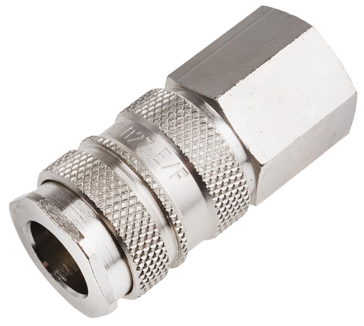 This is Brass Pneumatic Quick Connect Coupling G 3/8 Female Threaded manufactured by RS Pro. The manufacturer part number is 667-2018. It has a female gender thread . A quality product with a nice nickel plated finish. It features 35bar maximum operating pressure. The threaded is a g standard. The product is made from highly stable and reliable brass. It complies with cejn 410, rectus 27, tst 410 connection standard . It coupling is of female gender . It has a typical thread size of 3/8in. The threaded connection is g 3/8 female. The product has a 27 manufacturer series. Whereas, the minimum operating temperature of the product is -20°c. Its seal is made using nitrile rubber material . It has a maximum operating temperature of +100°c. It allows threaded connection type.