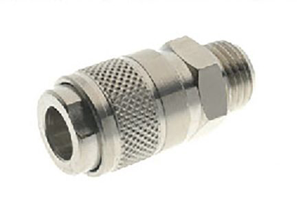 This is BSP MALE QUICK COUPLING 1/8 manufactured by RS PRO. The manufacturer part number is 187-8764. It has a male gender thread . Whereas, the minimum operating temperature of the product is -20°c. It features 12bar maximum operating pressure. The threaded is a bsp standard. The product is made from highly stable and reliable brass. It coupling is of female gender . It has a typical thread size of 1/8in. The threaded connection is g 1/8 male. Its seal is made using nbr material . It has a maximum operating temperature of +80°c. It allows threaded connection type.