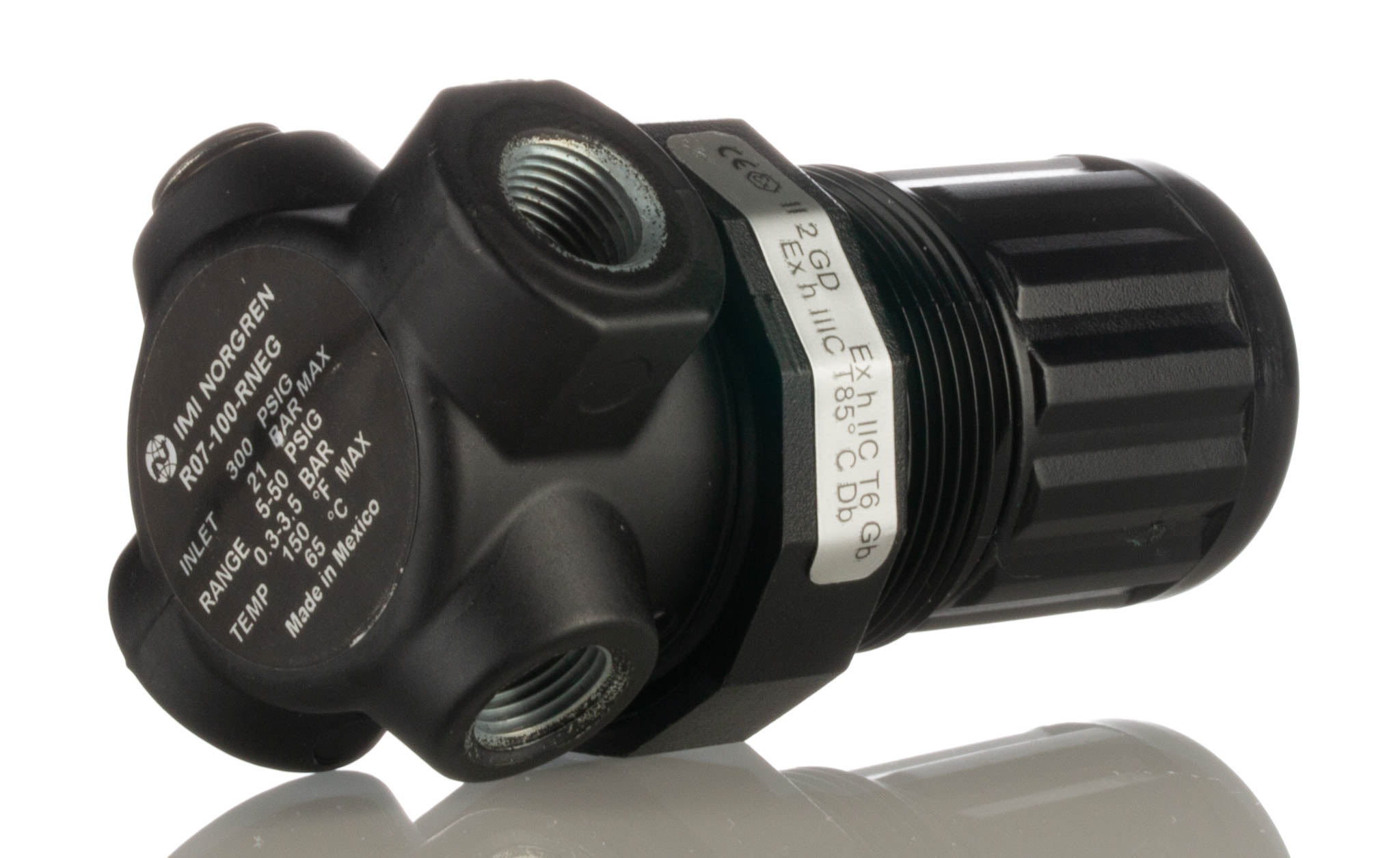 This is G 1/8 Pneumatic Regulator - 0.3bar to 3.5bar 1/8 in 20bar max. input manufactured by Norgren. The manufacturer part number is R07-100-RNEG. It has a minimum 0.3bar operating pressure . The product r07, is a highly preferred choice for users. The product is made from highly stable and reliable nitrile rubber (nbr), zinc alloy, acetal, brass. pneumatic regulator is a versatile product designed to provide user-defined applications. It has a maximum operating temperature of 65°c.
