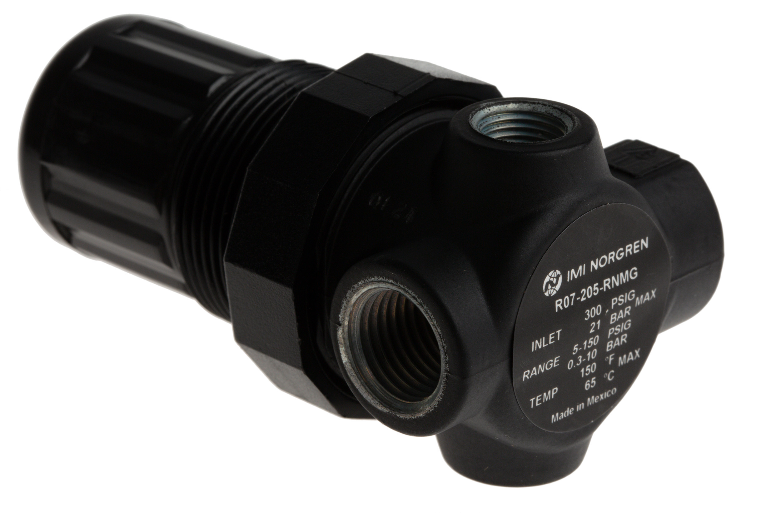 This is G 1/4 Pneumatic Regulator - 0.3bar to 10bar 1/4 in 20bar max. input manufactured by Norgren. The manufacturer part number is R07-205-RNMG. Provides g 1/4 of port connection. Furthermore, it has a maximum 20bar input pressure . The product has a minimum 0.3bar outlet pressure . It has a maximum 10bar outlet pressure . Additionally, it has a pressure gauge port of 1/8 in thread size . Moreover, it has 75mm of overall height. It has an overall length of 42mm. It has a/an rc 1/8 port size pressure gauge . It has a standard 1/4 in port connection thread size . Additionally, the product has a pressure gauge port of rc thread standard . The product has a r07 manufacturer series. Whereas, the minimum operating temperature of the product is -34°c. Additionally, it is offered with a typical 25.2m³/h flow rate . It has a maximum operating temperature of +65°c. In addition, it has a port connection of g thread standard .