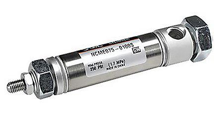 This is Double Action Pneumatic Roundline Cylinder manufactured by SMC. The manufacturer part number is NCME075-0100S. Provides npt 1/8 of port connection. Its diameter is 21.84mm. It features 1.7 mpa maximum operating pressure. The given dimensions of the product include 0.86 (dia.) x 5.28 (l)in. The typical product's weight is 174.6g. Its accurate length is 5.28in. The stroke is 25.4mm. The product has a ncm manufacturer series. Whereas, the minimum operating temperature of the product is +5°c. Concerning its action options, it allows double action. The bore with 3/4in of dimensions. It has a maximum operating temperature of +60°c. Additionally, it has a single rod .