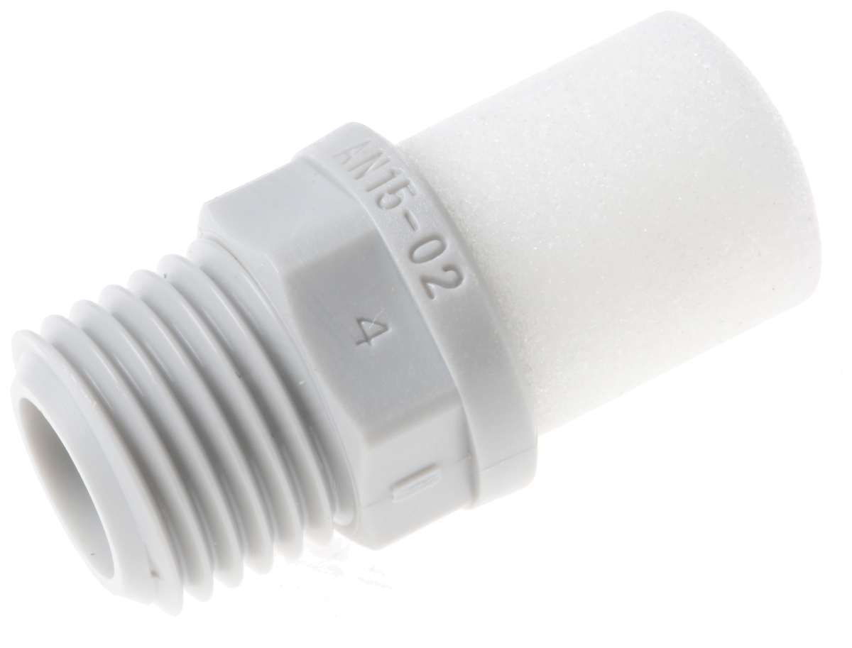 This is AN Resin 1Mpa Pneumatic Silencer Threaded R 1/4 Male manufactured by SMC. The manufacturer part number is AN15-02. Furthermore, it has a maximum 1mpa input pressure . It has a standard threaded inlet connection of 1/4 in thread size . Additionally, the product has a threaded type inlet connection . It has a maximum operating temperature of +60°c. The product is made from highly stable and reliable resin. It has a threaded inlet connection of r thread standard . It has a standard r 1/4 male threaded inlet connection . The product has a an manufacturer series. It has a threaded inlet connection of male thread gender . It comes in silencer configuration. Whereas, the minimum operating temperature of the product is +5°c.